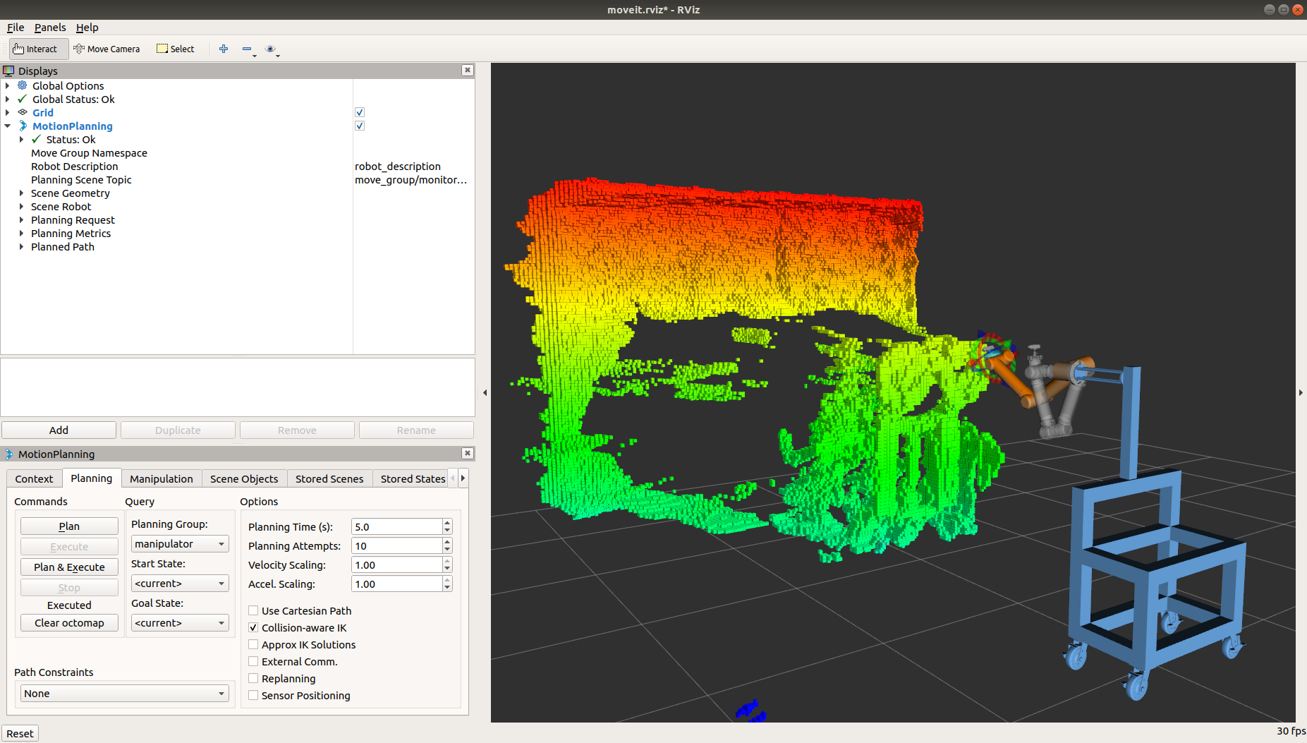 Moveit!을 이용해 Depth 카메라로 장애물을 인식하고 충돌 회피를 하는 것을 구현한 예제를 쉽게 찾을 수 있습니다.